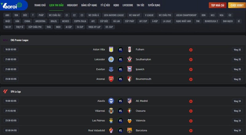 Web trực tiếp bóng đá Vaoroi cũng ghi điểm nhờ hệ thống cập nhật lịch thi đấu bóng đá sớm, đầy đủ và chính xác. Chỉ với vài cú nhấp chuột đơn giản, người dùng có thể tra cứu được thông tin về ngày giờ diễn ra trận đấu, đội bóng tham gia và thậm chí là địa điểm tổ chức. Nhờ đó, fan bóng đá có thể sắp xếp thời gian hợp lý để theo dõi trọn vẹn các trận cầu mình yêu thích.